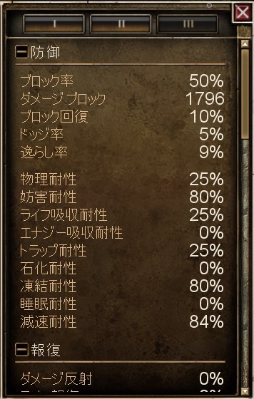 - 物足りない物理耐性。概ねbuff込みで25%前後と近接ビルドとしてはやや不安の残る数字に落ち着きます。