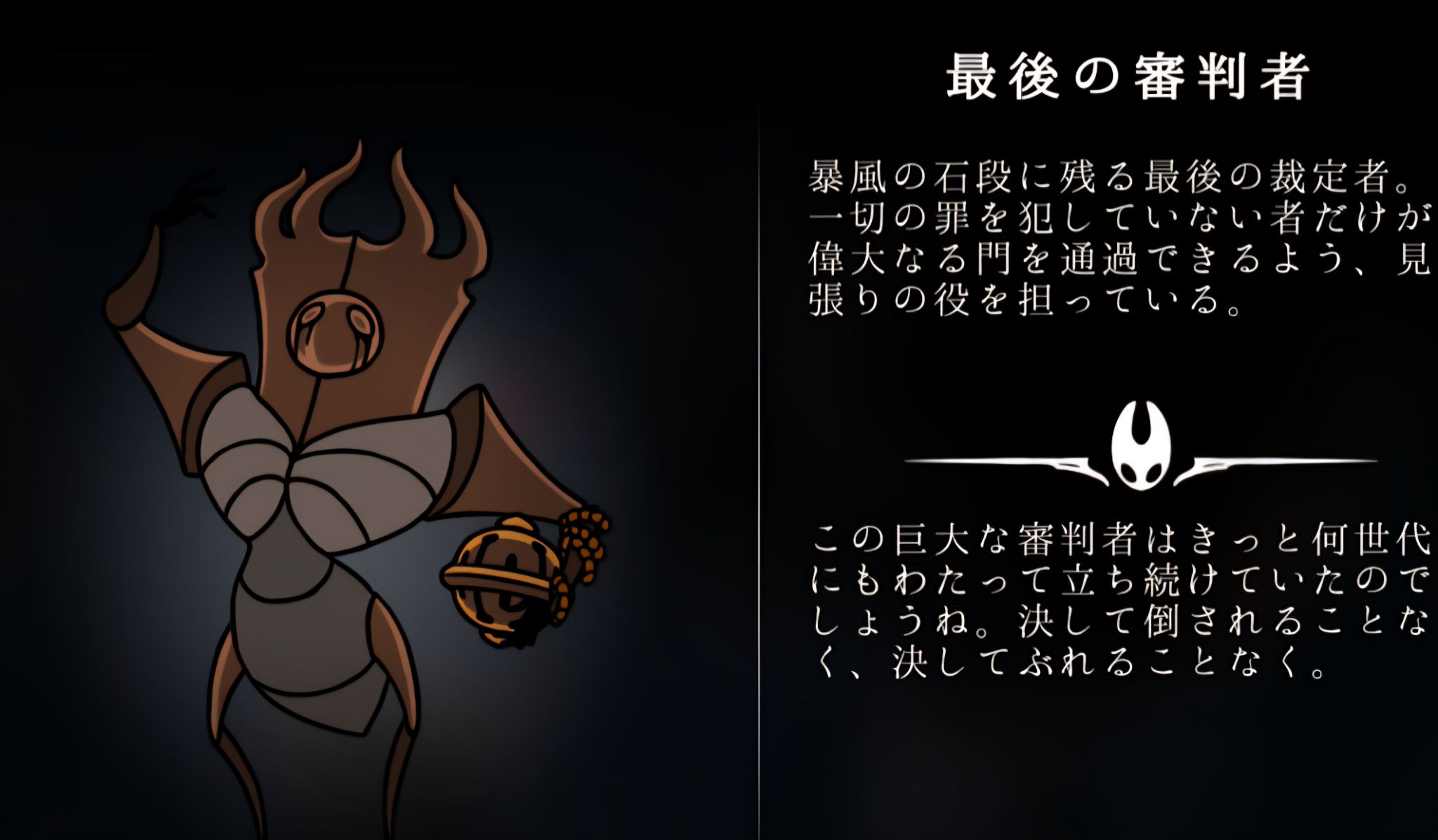 暴風の石段に残る最後の裁定者。一切の罪を犯していない者だけが偉大なる門を通過できるよう、見張りの役を担っている。 - 狩猟の書-説明