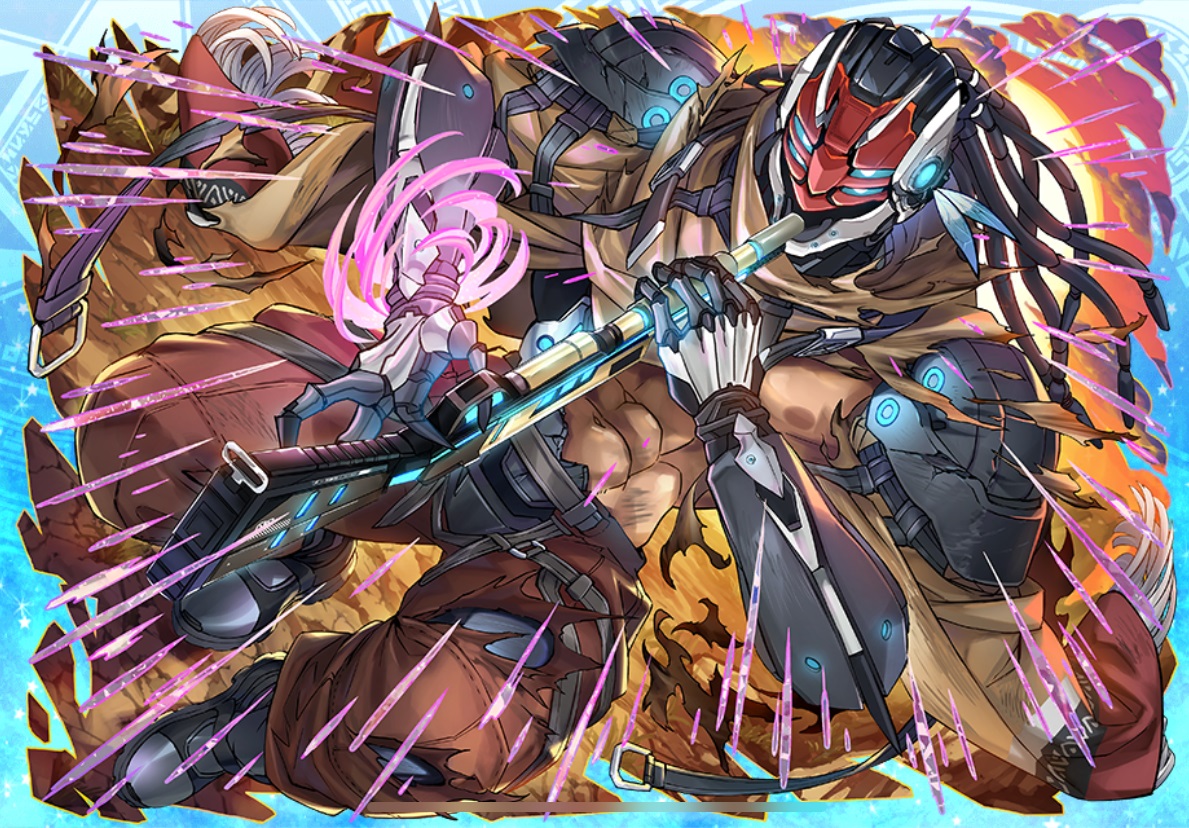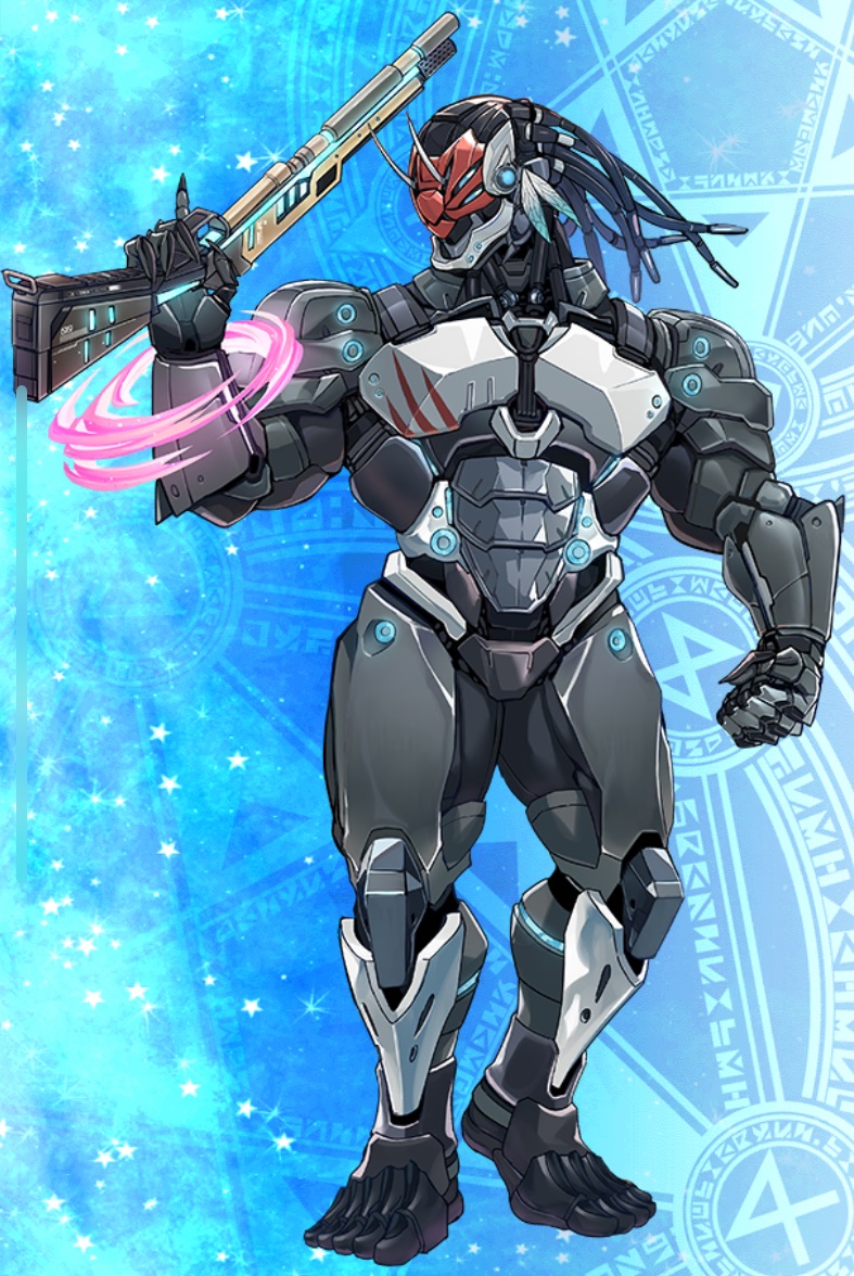 異世界グレイトスピリット出身の「転光生」が憑いた現地人、またの悪名を「移民使い」。幸運の笛吹きキリギリスとして知られ、彼が去った後の土地は死ぬと信じられている。かつて「ラボラトリ」と呼ばれた者たちにより、現在の昆虫改造人間へと変えられた。元々は、この地へ移民として連れて来られた人物。「神」に愛された幸運により、たとえ銃を口に咥えて撃っても、本人は決して死ねない。その先々で同じ移民の共連れを得ては失っていく、死神のような運命だと自嘲する。旅中では、ジャズプレイヤーとしてサックスの腕を披露して日銭を得ているという。家族と呼んだものたちを失った復讐と、ラボの生き残りを探すために行動する。復讐対象の残党を見つけると、喜びをこらえきれないように我を失って笑う。「この地以外に適応しうる」者たちのギルドに所属する。吹奏の応援で知り合った、とある人物からその百発百中ぶりに誤解を含む敬意を抱かれている。