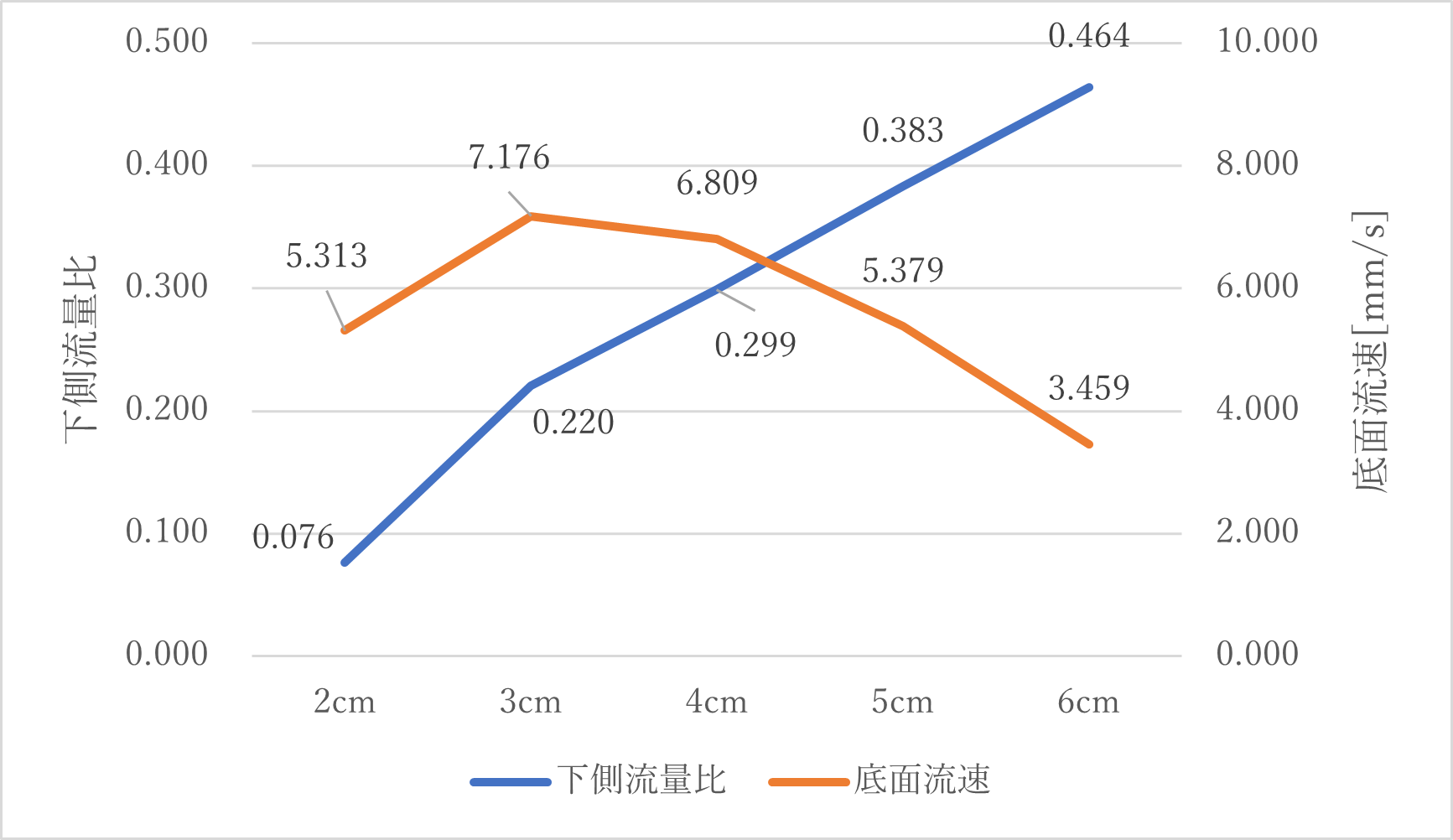 下側の流量比と底面から5ミリメートルでの流速をまとめると以下の通りになる.