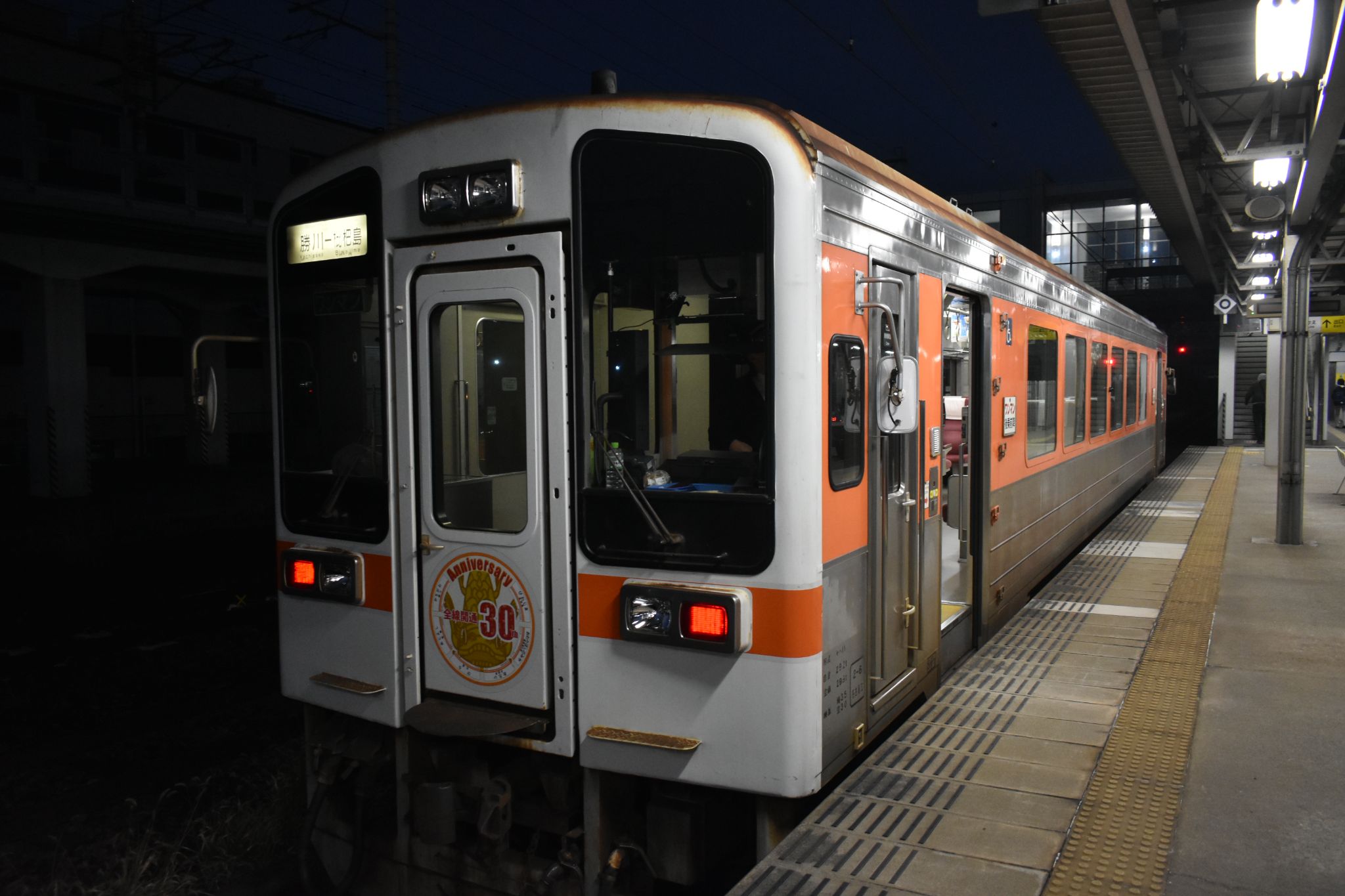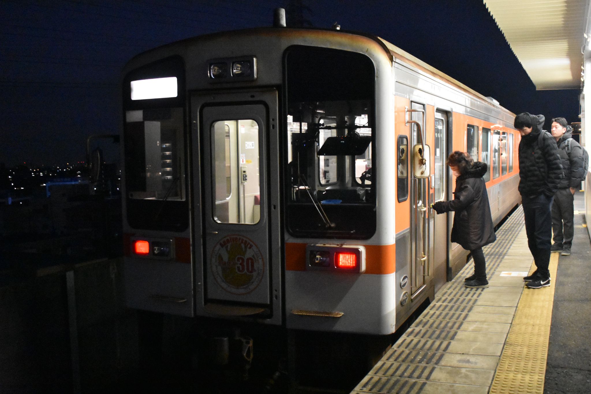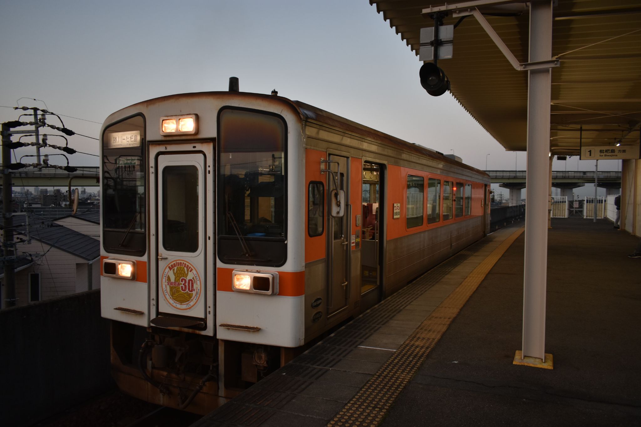 終点の勝川駅に到着。車体に反射する光、いいですね。