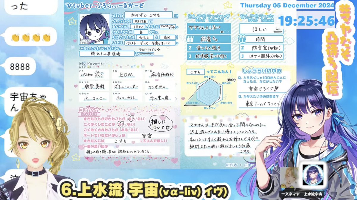 - ヴイアラとまりなすでご飯に行く機会があった時、宇宙だけスケジュールをミスって参加できなかったことがある。宇宙以外の4人がご飯を食べる一方その頃、宇宙はAC6の配信をしていた。