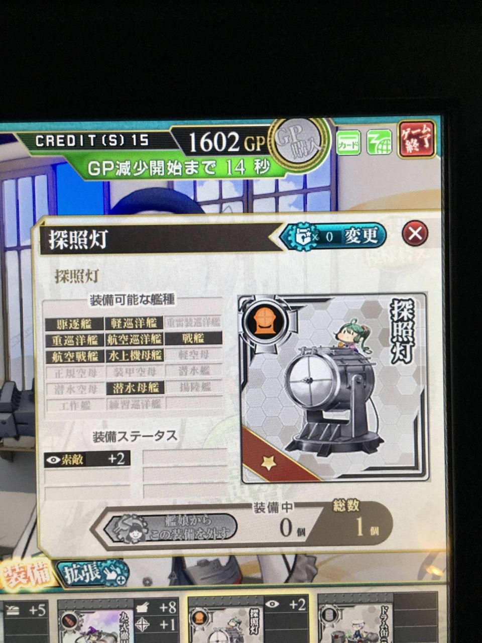 | 夜戦時照射用の探照灯です。 夜戦時に味方艦隊の射撃・雷撃を支援できますが、敵艦隊からの集中攻撃を浴びるリスクがあります。 (駆逐艦・軽巡洋艦・重巡洋艦・航空巡洋艦・水上機母艦・巡洋戦艦が装備可能です) | ||||||