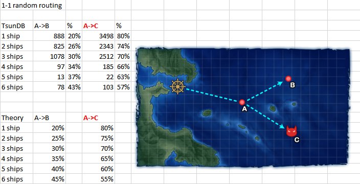 - ボスマスへの固定はできないが、出撃した艦隊の人数によってボス到達の確率が変動する。1~2隻の少数艦の出撃の場合、かなりボスマス到達に偏るようになっている模様。