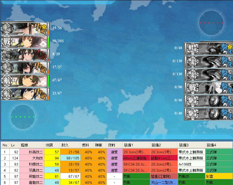 - 中央ルートは潜水艦&ル級flagshipが複縦で待っているため、まだ北で輪形のヲ級とタ級flagshipのほうがマシと思われます。