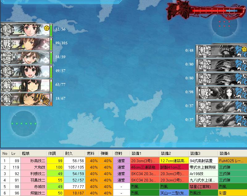 Fポッポ:複縦陣 最悪の組み合わせを引いてしまい利根が大破 撤退 夜戦までしてS勝利したもののDROPなし。