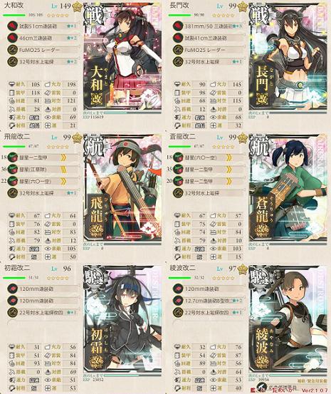 - 戦艦1+軽空母1+重巡or航巡1+軽巡1+駆逐2が最も安定しているか。戦艦と重巡・航巡には当然ながら三式弾を装備。