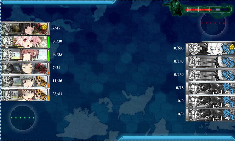 ゲージ破壊時はやや重めの編成で北→南(BEFG)ルートを選んだほうが安定する。- 空母や戦艦などの強力な敵艦との戦闘は避けられないが、こちらも相応の火力を確保できるので過剰に警戒する必要は無い。