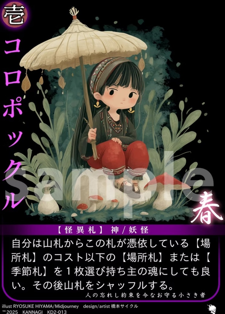 | 自分は山札からこの札が憑依している【場所札】のコスト以下の【場所札】または【季節札】を1枚選び持ち主の魂にしても良い。その後山札をシャッフルする。 | ||||