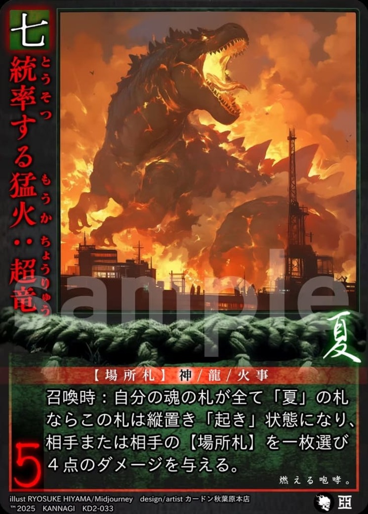 | 召喚時:自分の魂の札が全て「夏」の札ならこの札は縦置き「起き」状態になり、相手または相手の【場所札】を1枚選び4点のダメージを与える。 | ||||