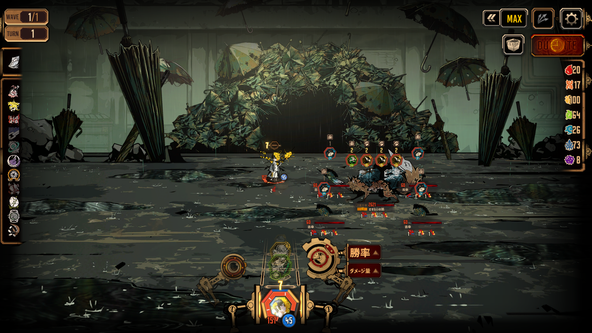 - 傘を全滅させる必要はなく、狐の攻撃にマッチ勝利していれば放置しても脅威ではない。精神力を20程度確保できたキャラは狐の相手を優先するといいだろう。