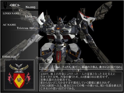| ・Alethea:アレシア。機体名のTristramは、夫の名前(フィクス・トリシュトラム)。 ・どんなに優しくされても、他の男には絶対になびきません。 ・アルテリア襲撃後までは生き残りますが、その後何らかの理由でリタイア。 |