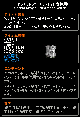 - オリエンタルドラゴンのエンチャントについて。ヘルム→帽子属性、ガントレット→ガントレット属性ではないを確認。ブーツは未確認。 -- 2014-02-20 (木) 13:38:33