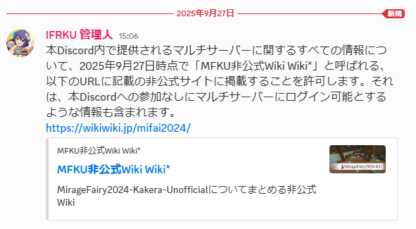 本Discord内で提供されるマルチサーバーに関するすべての情報について、2025年9月27日時点で「MFKU非公式Wiki Wiki*」と呼ばれる、以下のURLに記載の非公式サイトに掲載することを許可します。それは、本Discordへの参加なしにマルチサーバーにログイン可能とするような情報も含まれます。