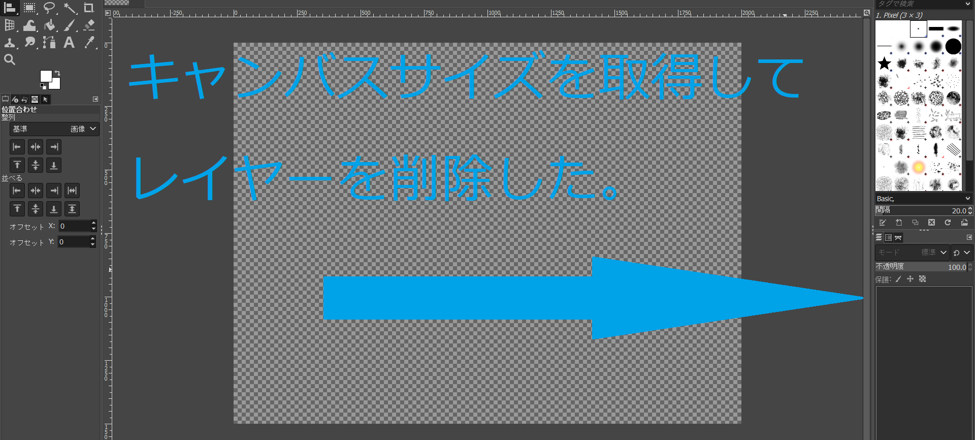 そうして、キャンバスサイズを取得したら、GIMP右下のレイヤーを削除。