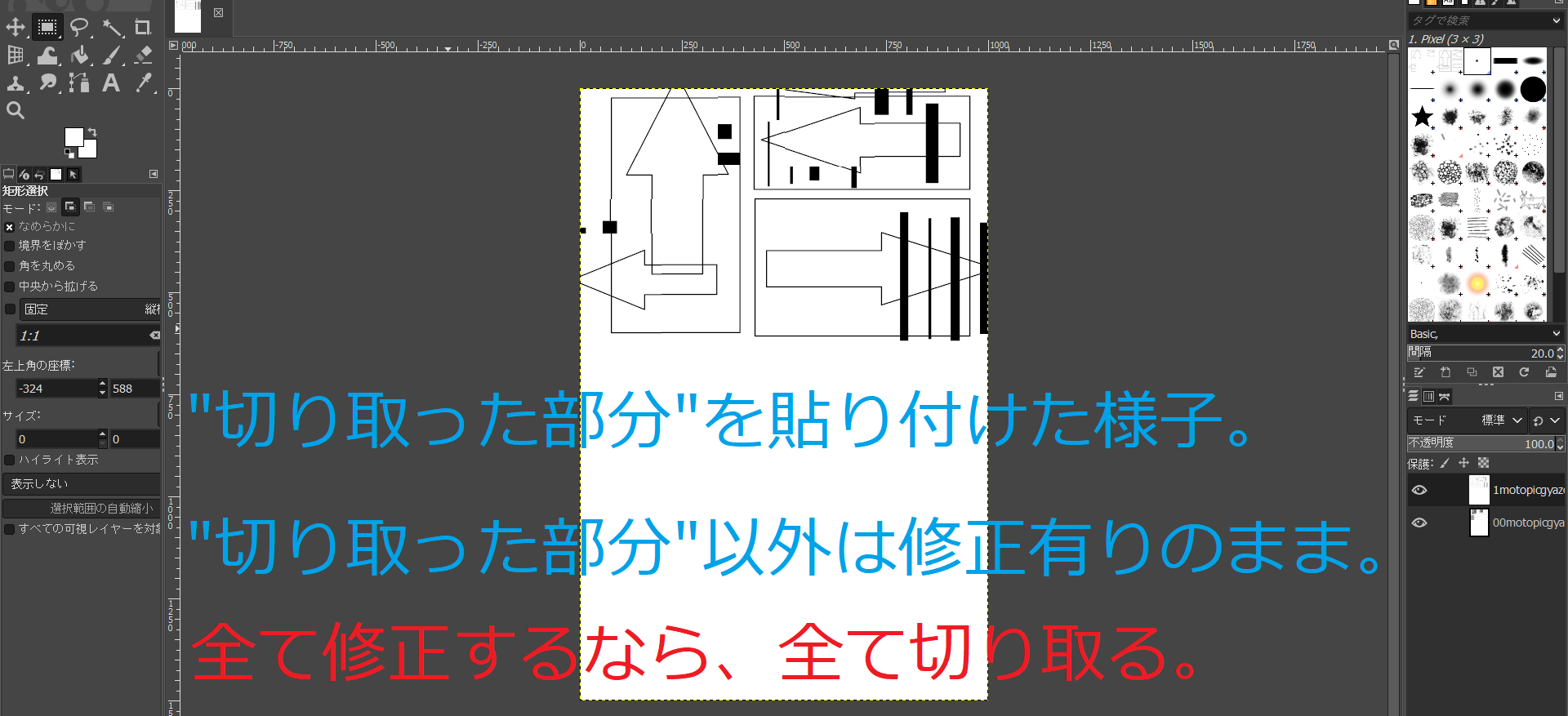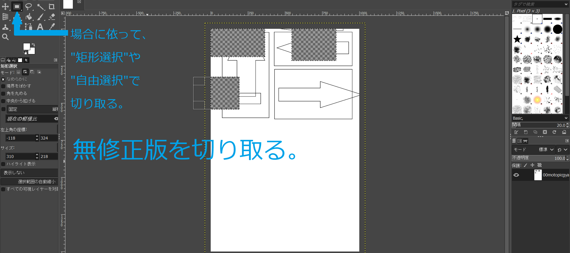 GIMP左上の"矩形選択"で性器の描写の部分を切り取る(ctrl+x)。