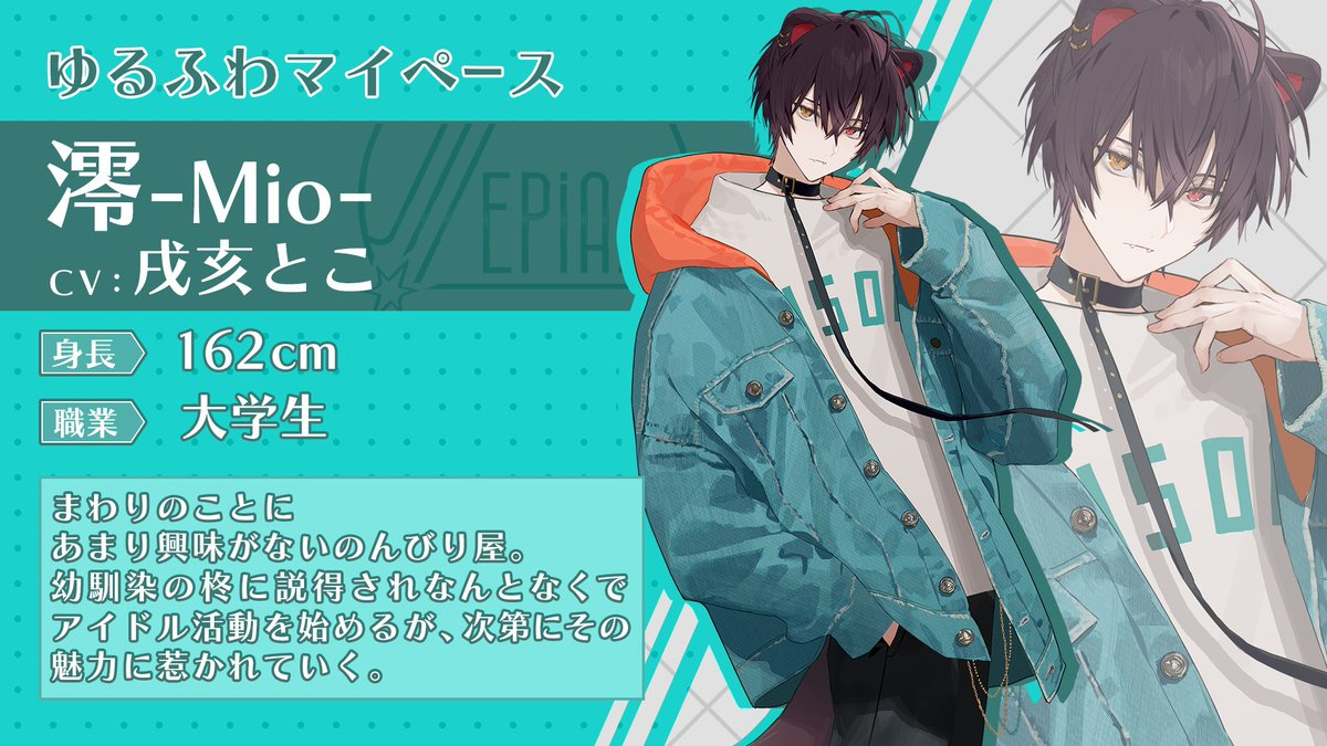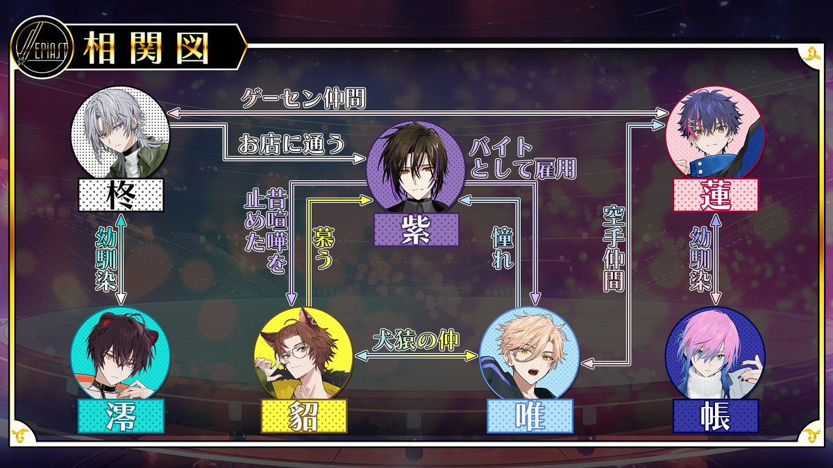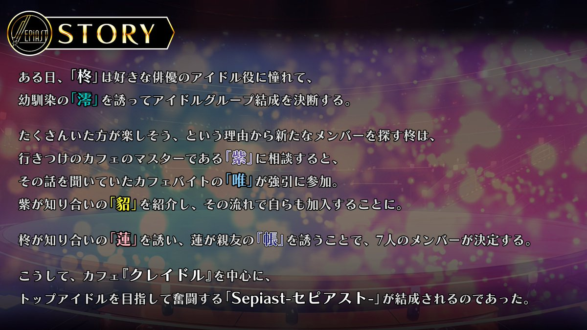 「Sepiast」とは、柊-Shu-、蓮-Ren-、帳-Tobari-、澪-Mio-、唯-Yui-、貂-Ten-、紫-Yukari-の7人からなる男装アイドルユニットである。