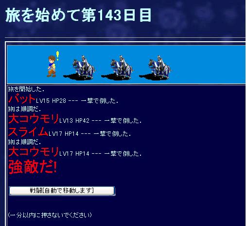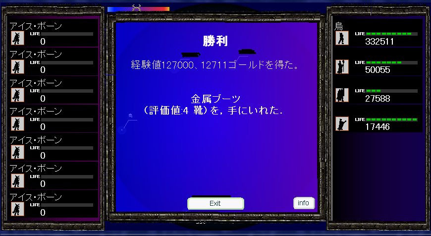 - 戦闘画面ては烏って名前です。雪原での戦闘画面と戦闘結果画面を撮りました。ですが、PTの方々の名前を消し忘れた部分があったの再度アップロードしなおし、Wikiも少し編集させいていただいたので報告させていただきます。 -- yakkun9号? 2007-03-28 (水) 10:04:47