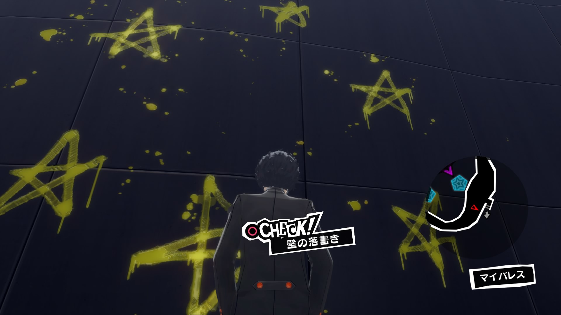マイパレスのその対象アワード達成アイコン(アワード『人生の先輩』)が表示される場所から2階の(MAP下側の)入り口横までの床の動線上に垂れ落ちたペンキの跡と、