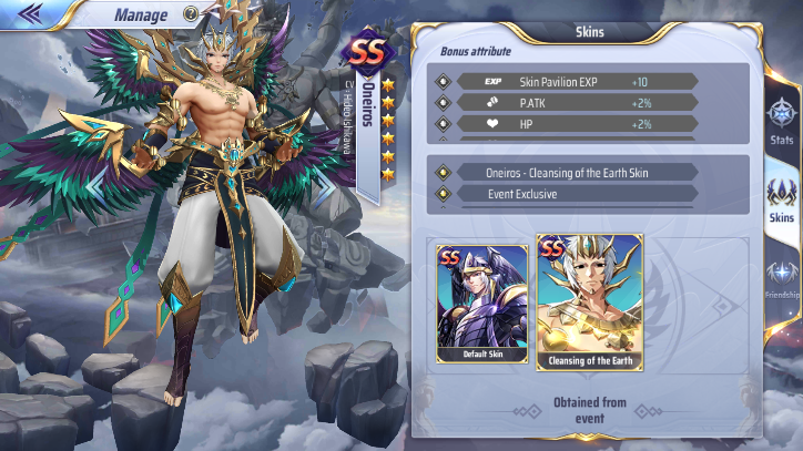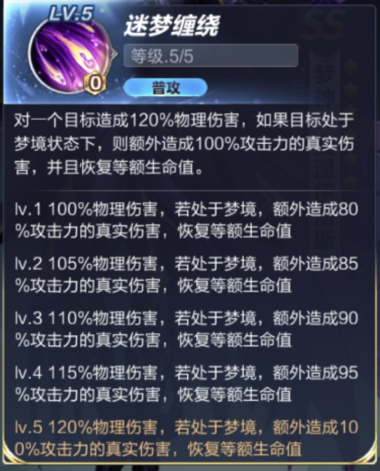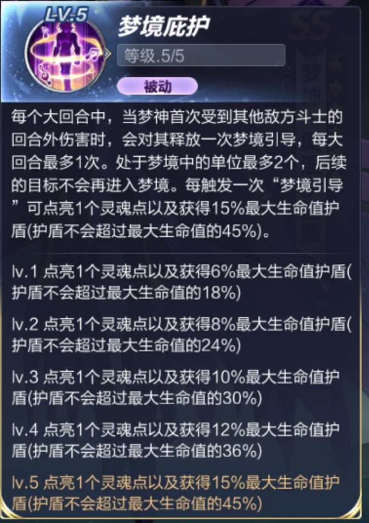 | 夢境加護(パッシブ) | 毎自ターン、オネイロスが夢境の印付以外からダメージを受けた時、 (20,40,60,80,100)% の確率で夢境への誘いを発動(毎ターン1回のみ)。夢境の印付は最大2名まで、その後夢境への誘いを使用しても夢境の印は付かない。夢境への誘いが発動する度、霊魂がオネイロスの周りに1つ増え、最大HP(7,8,10,12,15)%の盾数値の盾になる(霊魂は3つまで、盾数値は最大HP70%が上限)。 | Dream Ward In each round, the first time Oneiros takes damage from an enemy Saint outside of their turn, he has a (20,40,60,80,100)% chance of casting Dream Guide on his attacker. The skill can be triggered up to 1 time in every round. There can only be up to 2 units in the Dreamscape state at a time. The subsequent targets will not enter the Dreamscape. Each time Dream Guide is triggered, Oneiros will activate 1 Soul Point and gain Shield equal to (7,8,10,12,15)% of his Max HP (Shield will not exceed 70% of his Max HP). lv.1 A 20% chance of casting Dream Guide; gains Shield equal to 7% of Oneiros' Max HP (Shield will not exceed 70% of his Max HP). lv.2 A 40% chance of casting Dream Guide; gains Shield equal to 8% of Oneiros' Max HP (Shield will not exceed 70% of his Max HP). lv.3 A 60% chance of casting Dream Guide; gains Shield equal to 10% of Oneiros' Max HP (Shield will not exceed 70% of his Max HP). lv.4 An 80% chance of casting Dream Guide; gains Shield equal to 12% of Oneiros' Max HP (Shield will not exceed 70% of his Max HP). lv.5 A 100% chance of casting Dream Guide; gains Shield equaI to 15% of Oneiros' Max HP (Shield will not exceed 70% of his Max HP). |