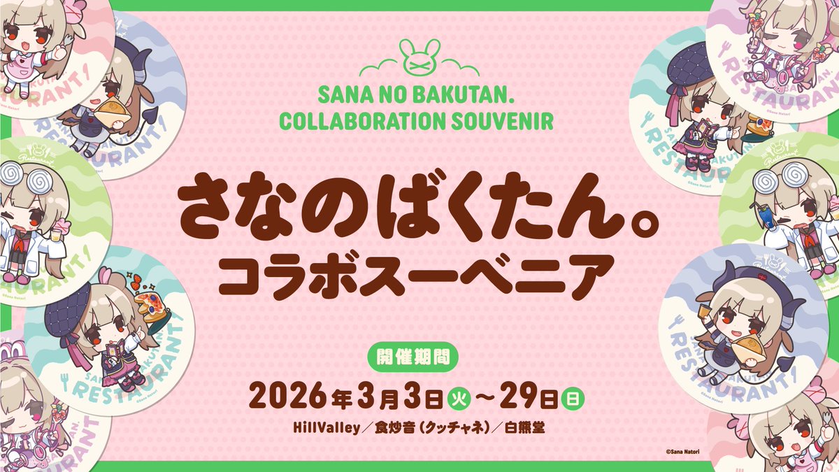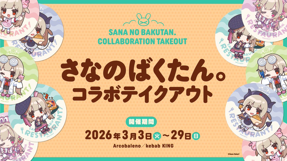 - 「さなのばくたん。レストラン」「さなのばくたん。コラボテイクアウト」「さなのばくたん。コラボスーベニア」についてはイベント公式Xの注意事項に関するポスト①・②を必ず確認のこと。いかなる場合も各店舗への直接の問い合わせをしないよう注意。