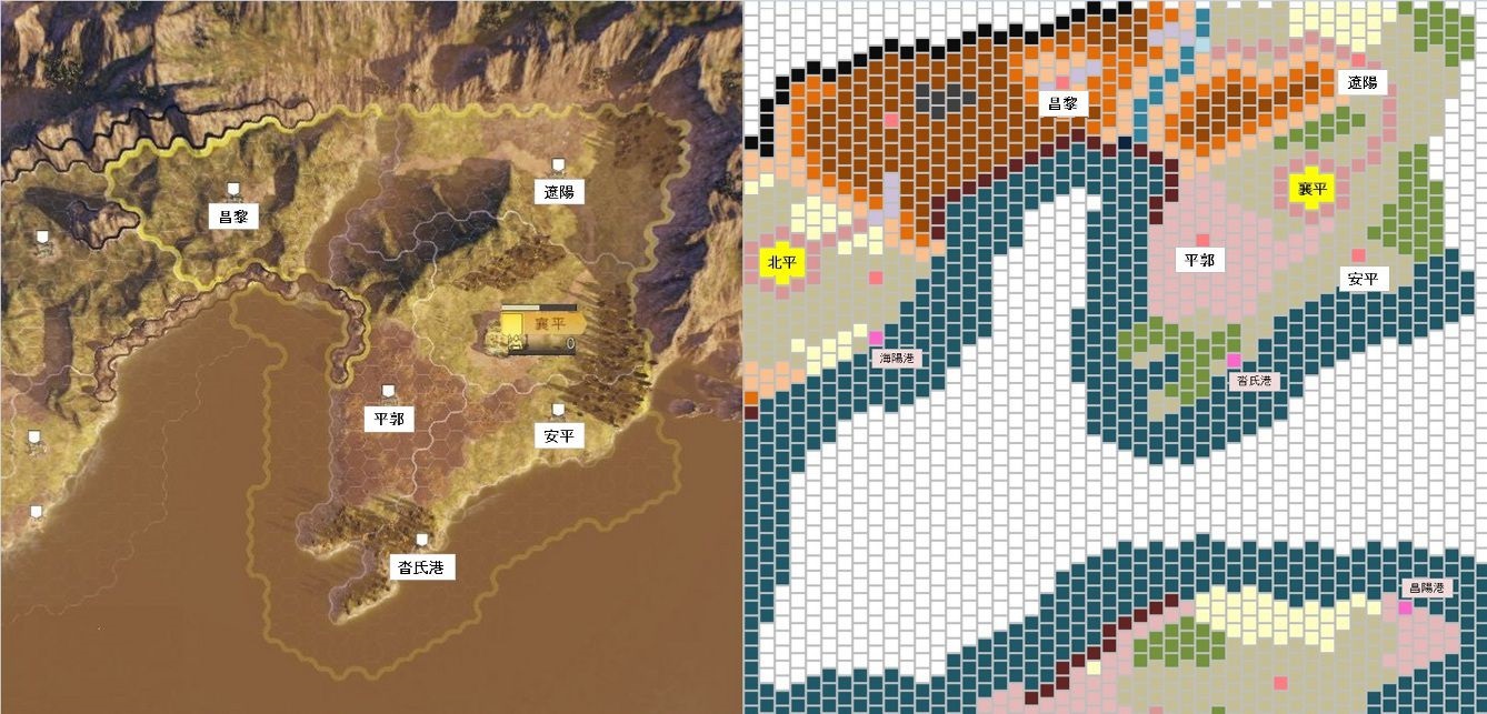 - ただし攻め手に異民族武将がいる場合は北側の山を進軍し、昌黎から平郭へ抜けて府を押さえたのちに都市攻撃というルートを取ることが多い。