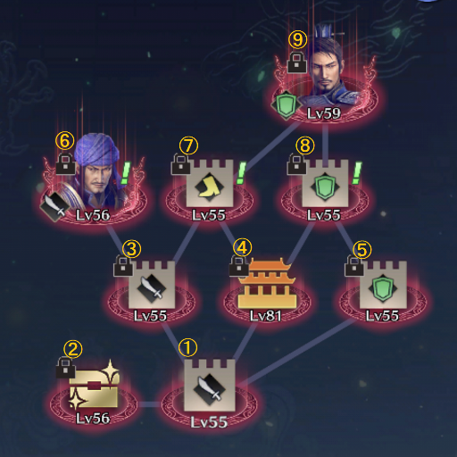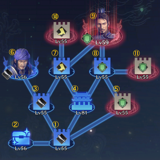 - 曹仁撃退戦2、3、4、5、6のうちの2つをクリアすると7、8、9、11への道が繋がる