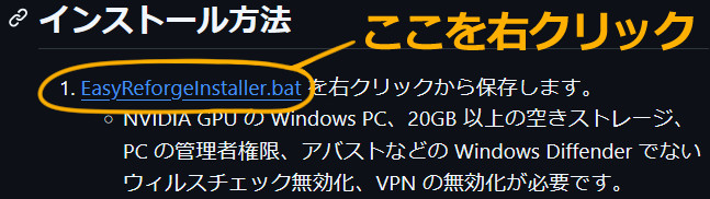 - サイトを少しスクロールした先の「EasyReforgeInstaller.bat」を右クリックし、