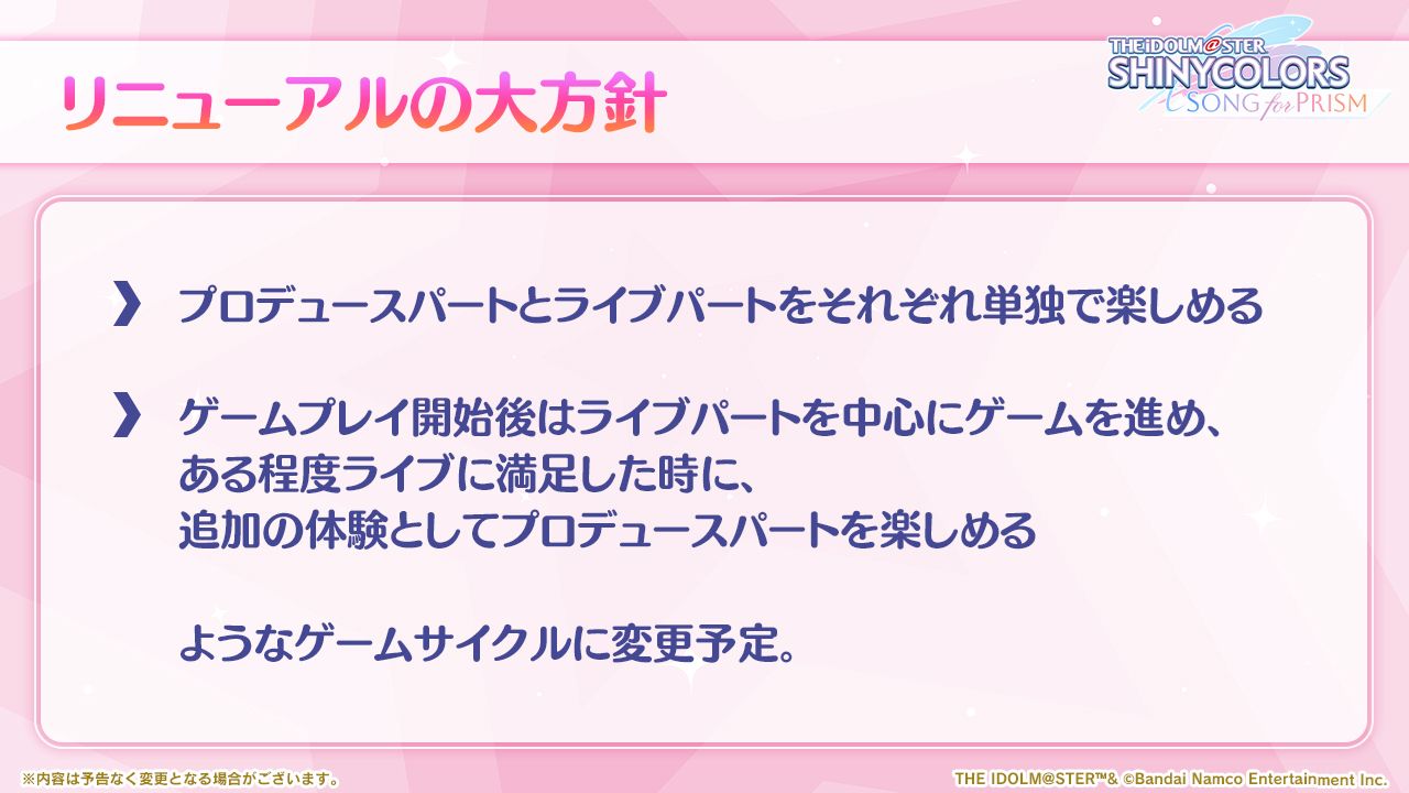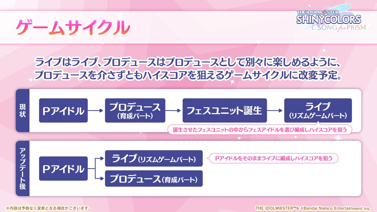 - ライブとプロデュースをそれぞれ単独で楽しむことができるようにゲームサイクルをリニューアルしました。