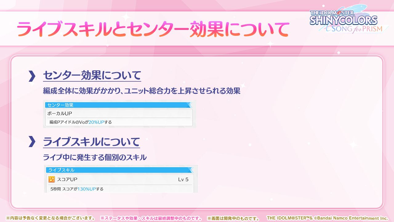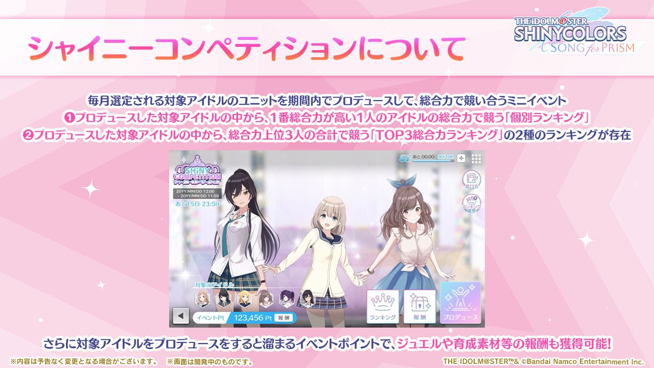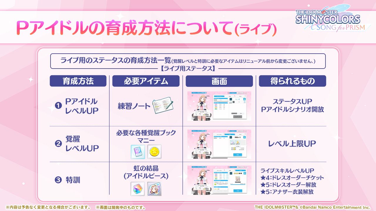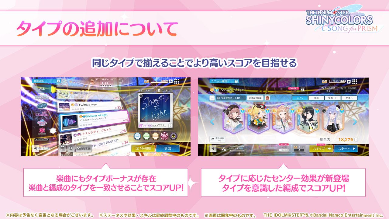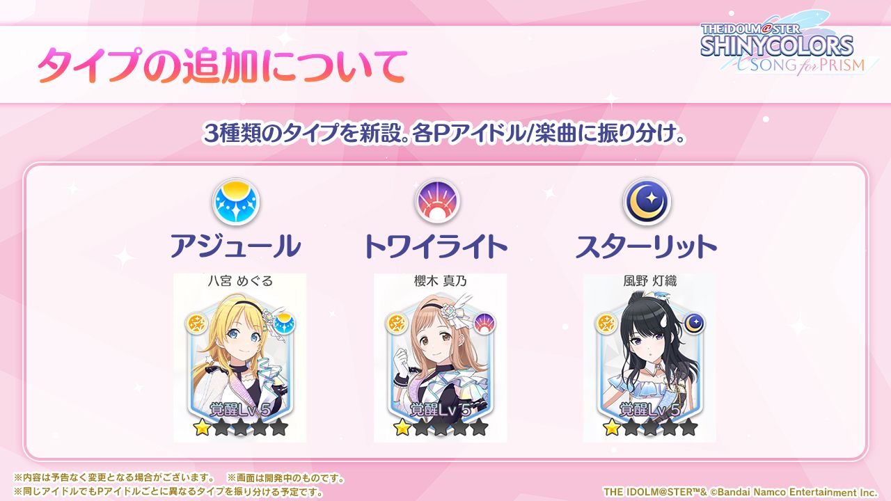 - Pアイドルと楽曲に「アジュール」「トワイライト」「スターリット」のいずれかの「タイプ」を新たに追加しました。