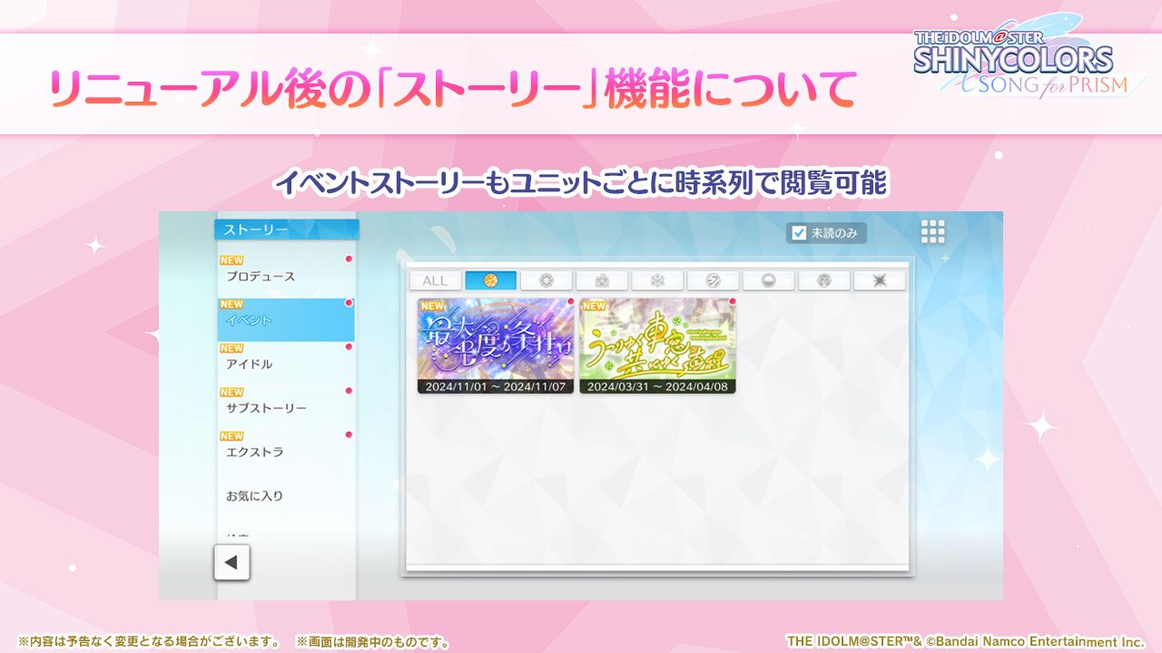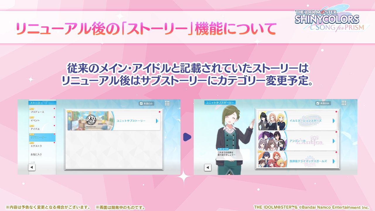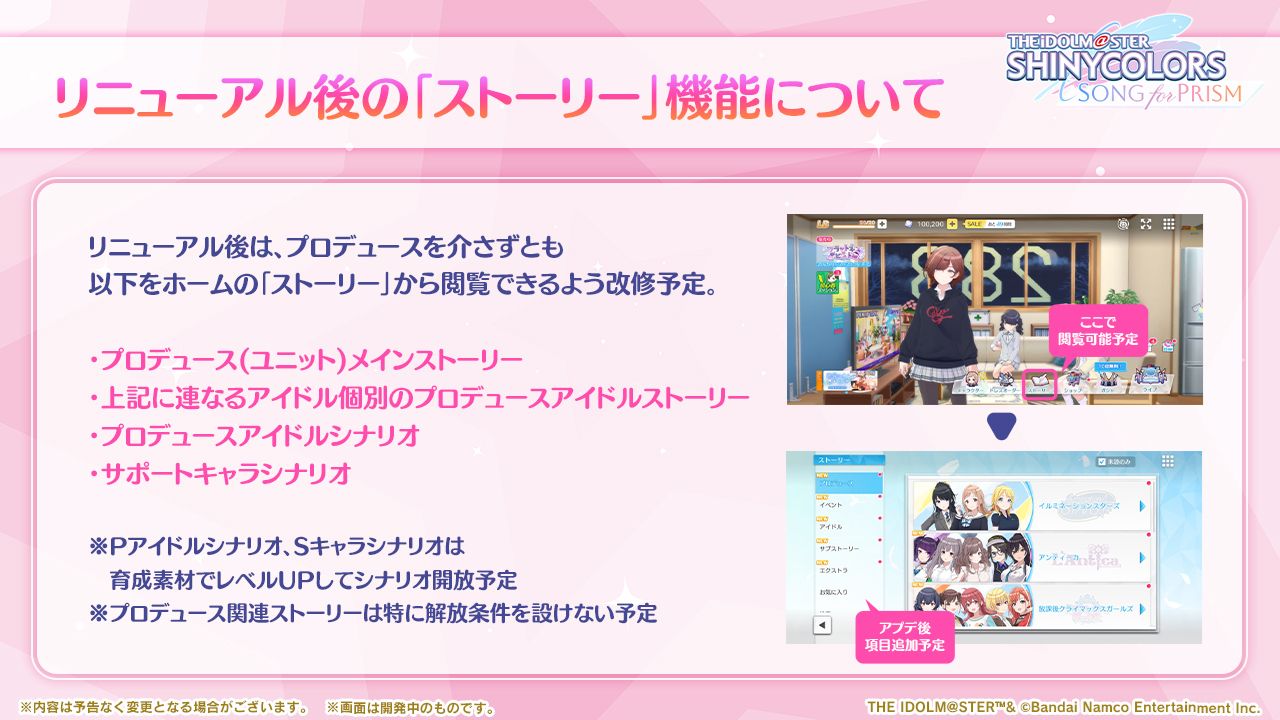 - ストーリー機能にて「プロデュースシナリオ」「Pアイドルシナリオ」「Sキャラシナリオ」を閲覧できるようにしました。