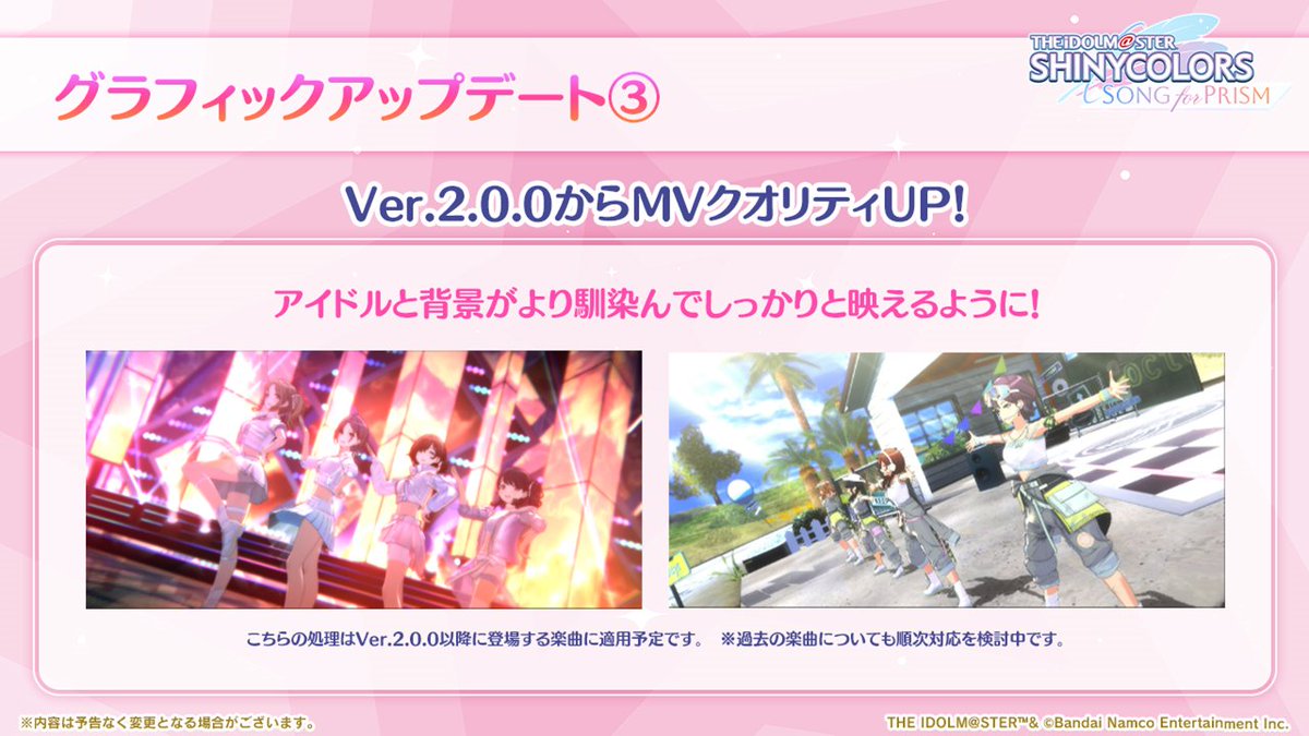 - 画面分割カットシーンが含まれる一部の楽曲MV再生中に、画面分割カットシーンで表示が乱れる不具合を修正しました。
