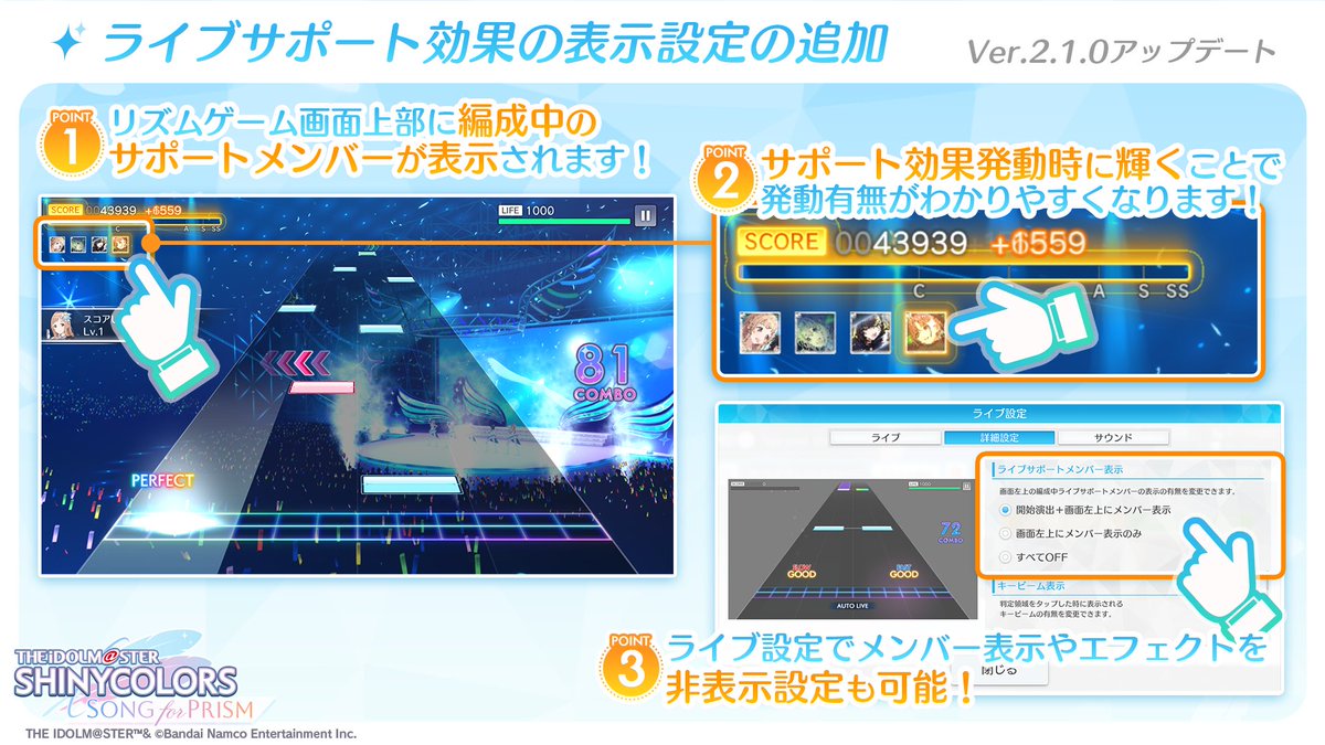- リズムゲーム内に編成中サポートメンバー表示を追加し、ライブサポート効果発動の有無を確認できるようになりました。