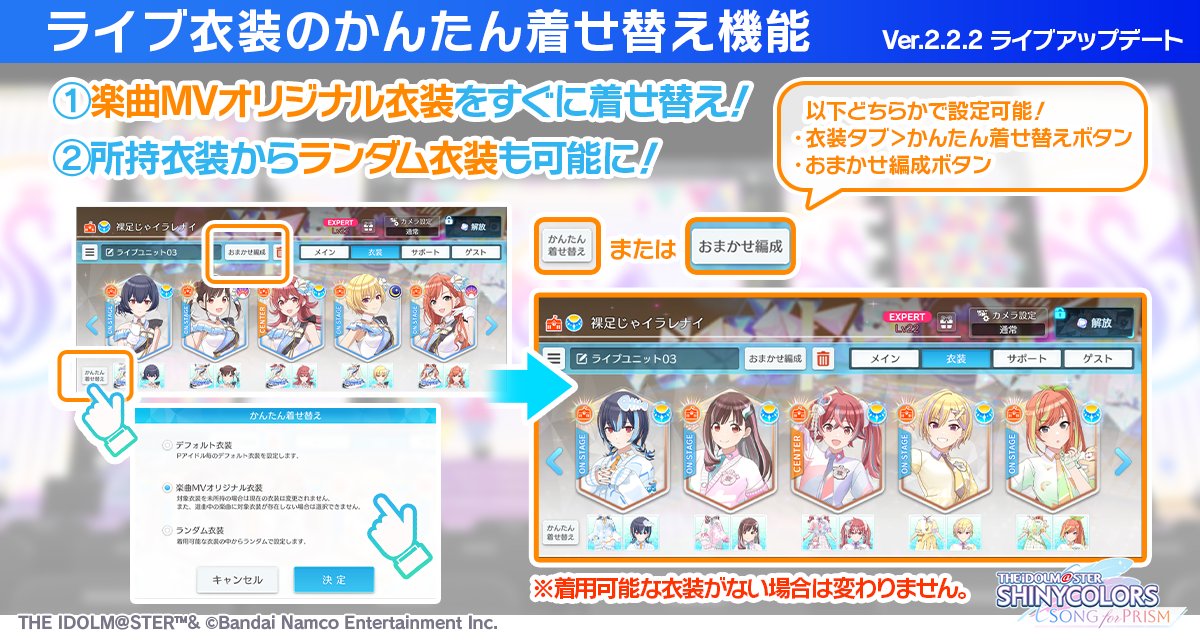 - 編成画面において、MVのオリジナル衣装などを手軽に設定できるようになる「かんたん着せ替え機能」を追加しました。