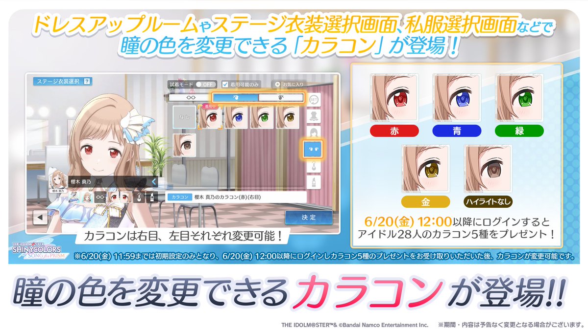 - ドレスアップルーム、およびドレスオーダーに瞳の色を変更することができる機能「カラコン」を追加しました。