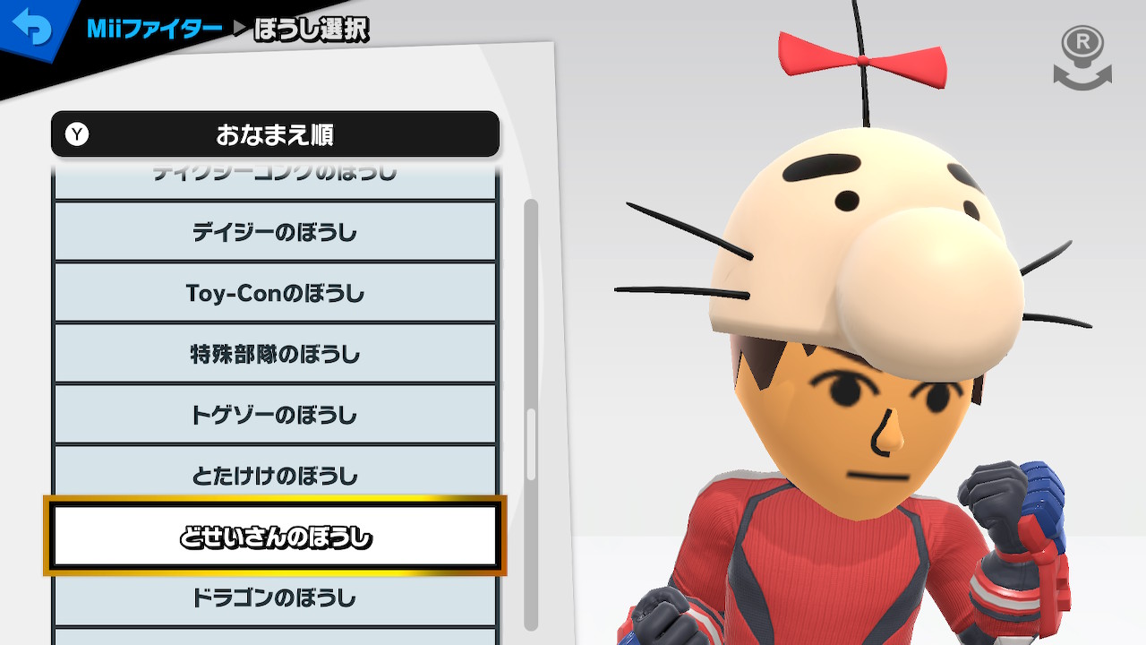 | 入手条件 | ぼうし | クリアゲッター:「その他」の「Miiの「ぼうし」を 10種類手に入れる」を達成する |