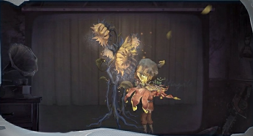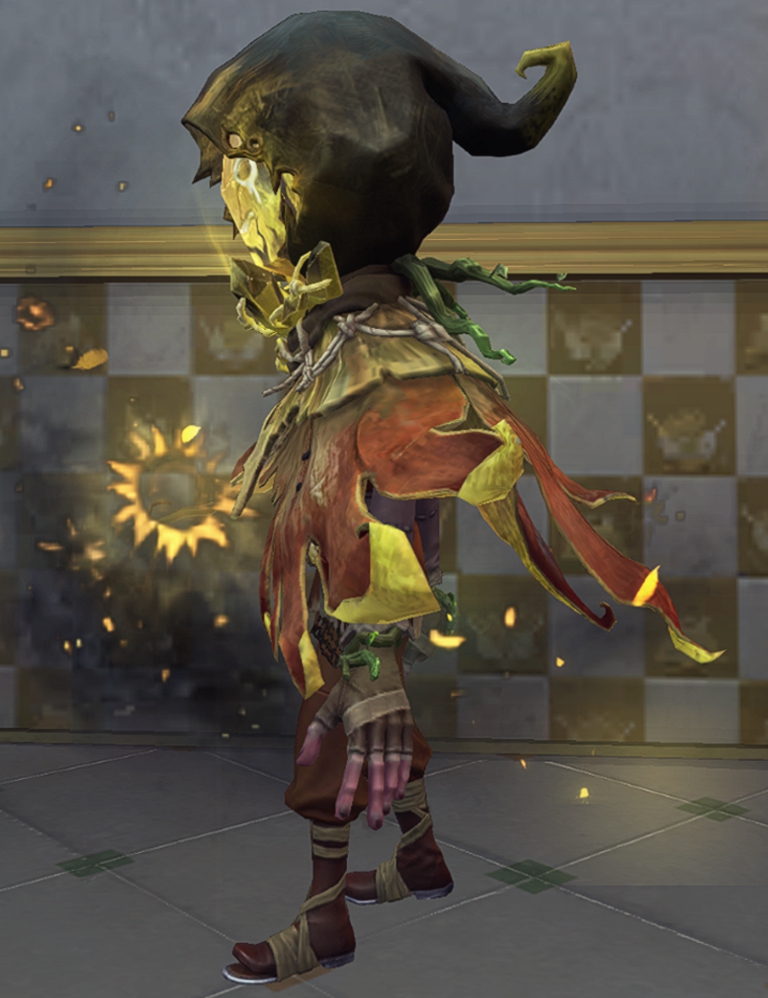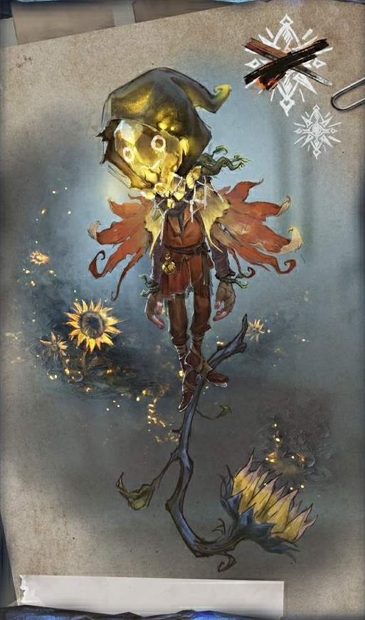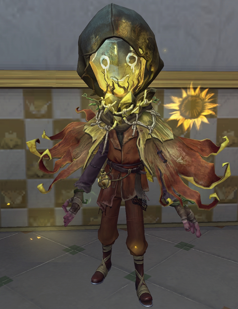 配色は主に黄褐色、光る黄色の晶石で作られた真実を隠す「ガラス張り」、頭部に布を巻いていて、ボロボロのフードに顔料で逆向きの向日葵が大きく描かれています。