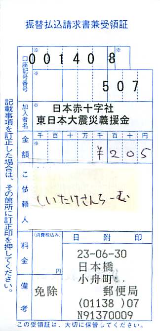 善意のご寄付と合わせて205円を日本赤十字社に振込みました。