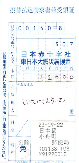 2011年11月01日現在 ¥42,105 のご協力を頂き、日本赤十字社を通じて寄付いたしました