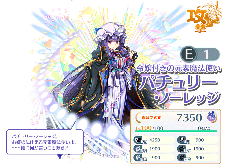 - それでも十分過ぎるほどに使えるが、パチュリー以上のレリック・エピックキャラも多数居る為、そちらが揃っているならわざわざ使う程でもない、と言うのが現状。