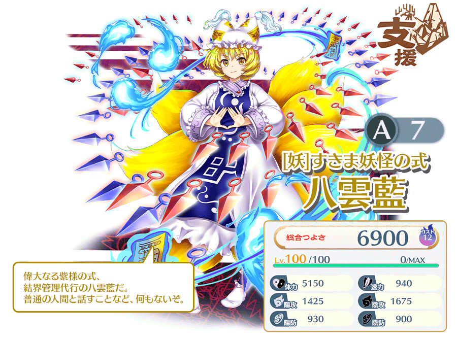 - 妖々夢版、A7世界群の八雲藍。L1版とは異なり支援式での実装。属性、使用感は大きく異なる。