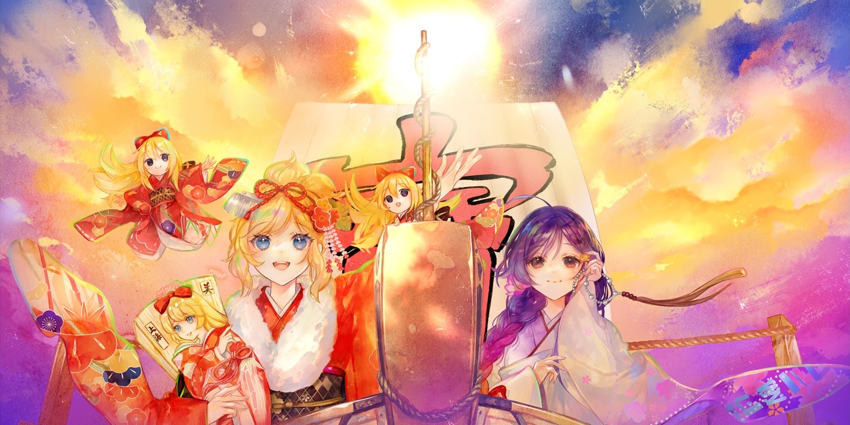| 解説5 | 聖輦船からの景色は壮観だ。 空を見上げても神秘的。 地上を見下ろしても刺激的。 目を閉ざしても、魔界の風が強く吹く。 ふたりの観光旅行。 「あの神殿はまだあるかしら」 広大な魔界は、いつどこを見ても、懐かしさと新しさが同居している。 神が創ったこの世界を、発展させるのは中の者たちである。 ふたりの会話は弾む。 「お土産屋はあちらに──」 「いやいや、あっちの方が品揃えが──」 聖輦船は右へ、左へ、蛇のように曲がりながらも、やがて魔界の地へと降り立つ。 降機したふたりは手を繋いで、魔界の地への一歩を踏み出した。 「せっかくのお正月ですし──」 「全部回っちゃいましょう!」 | |||||||||||