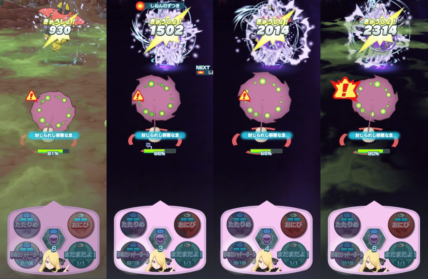 | タイプ | ゴースト | 【解放条件】 自分が技を1回つかったとき 【封印条件】 なし 攻撃が必ず命中する この技の回数をすべて減らす 減らした回数が多いほど威力があがる 20%の確率で相手の特防を1段階さげる 1回の攻撃で残り回数を108減らしたときは相手をひるみ状態とこんらん状態とバインド状態にする |