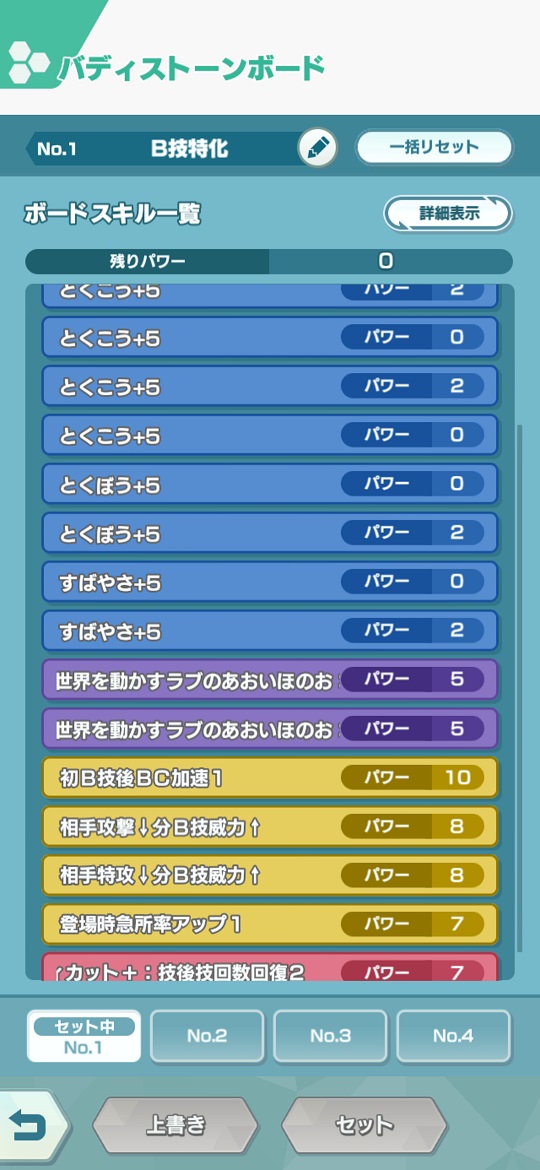 なんで「初B技後BC加速1」を取るんです?と疑問視する俺もいるだろうが、アニバN・ゲーチス・晴れ使いの編成だと結構ゲージ回転に悩まされることがあり、初回B技を打ってから2回目B技を打つまでの区間に一手行動できなかった場合(主にゲーチスがおたけび×3→フハハ!×2→待機とターンを回す)にB技の帳尻を合わせるために必要だったりする。