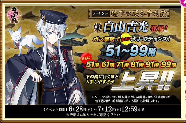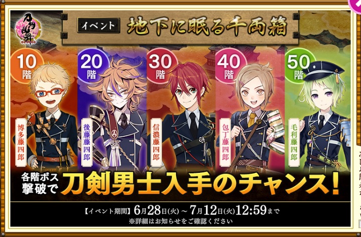 - 特定の階層のボスを撃破すると、まれに「博多藤四郎」「後藤藤四郎」「信濃藤四郎」「包丁藤四郎」「毛利藤四郎」「白山吉光」が入手できます