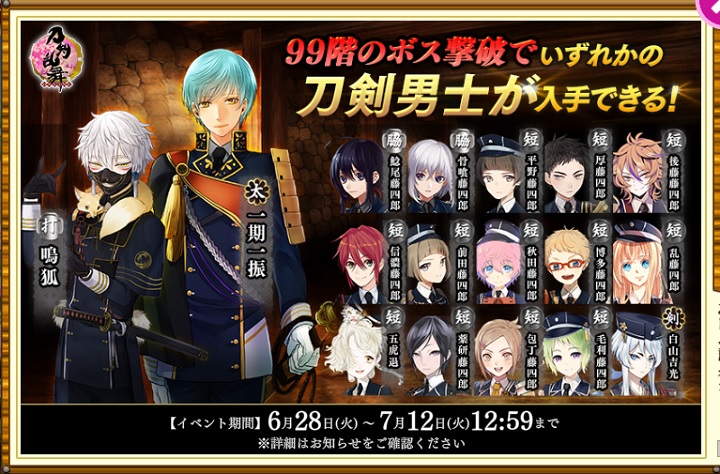 - なお、今回('22夏)の99階ボスマスでは刀派:粟田口のみ入手可能となっている。(鬼丸国綱を除く)