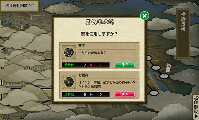 所持している賽を振ることで、出た目の数だけ行動回数を増やすことができます。
