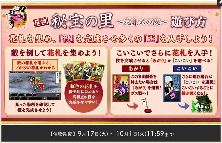 複数回「こいこい」をした場合、「こいこい」を行うごとに前回より強力な敵が出現し、勝利報酬として入手できる「花札」が1枚ずつ増えます。