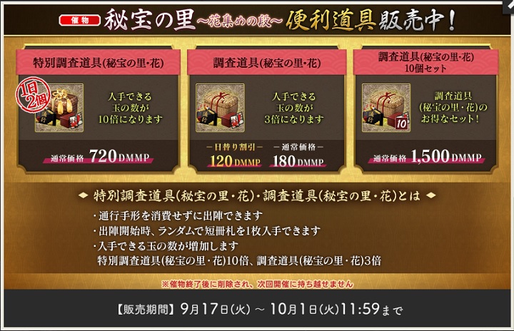 ※催物専用便利道具のため、「秘宝の里 ~花集めの段~」終了後、未使用分は消滅します。