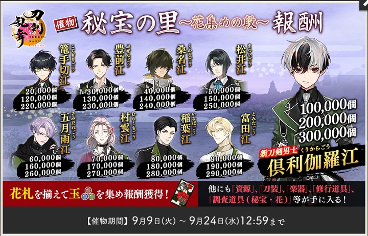 | 四光・三光・花見酒・月見酒 | 刀剣男士の生存を少し回復します |